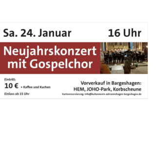 Am 24.Januar 2026 ab 15:00 Uhr Kaffee und Kuchen um 16:00 Uhr Konzert in der Kulturscheune Bargeshagen Der Kulturverein Admannshagen-Bargeshagen lädt herzlich ein zum Neujahrskonzert. „Dafür konnten wir wieder den Gospelchor der Region Bad...